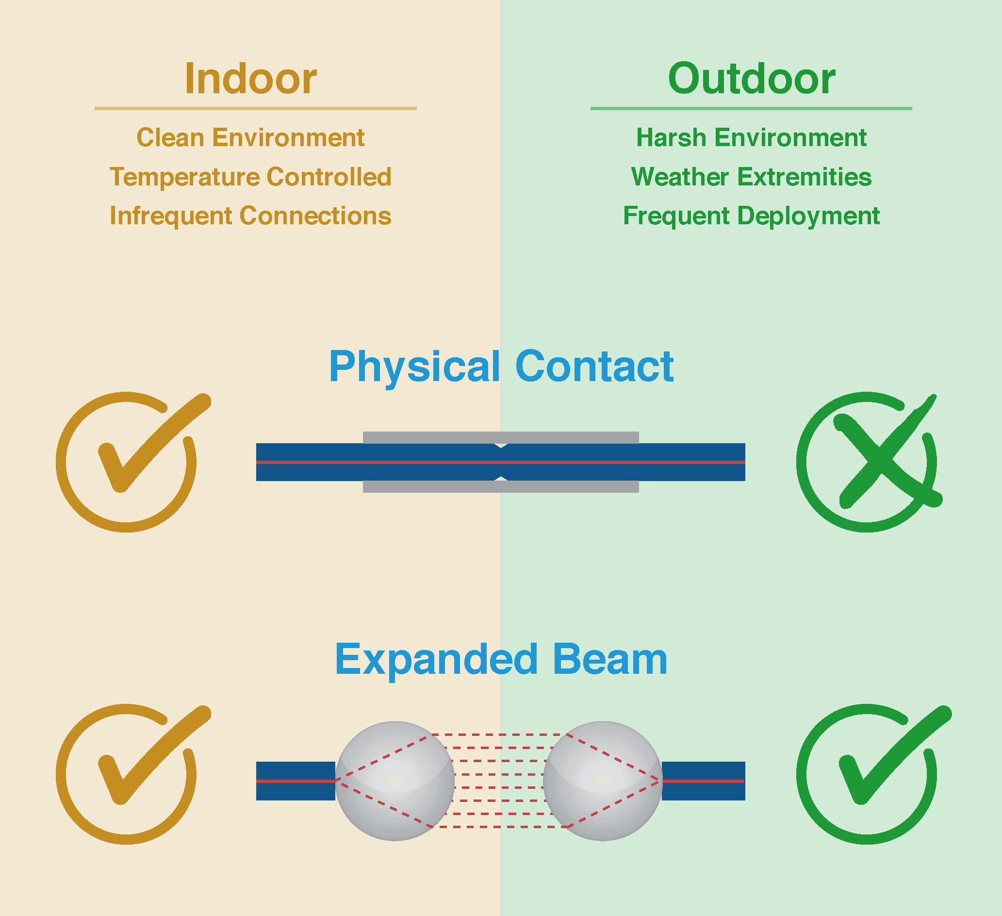 Ultimately, the conditions within which the cabling and connectors will be placed governs which connection system should be used. Physical contact connections currently have lower insertion losses than expanded beam, but their fragility in harsh or challenging environments can mean they have poor performance over time and require regular cleaning and maintenance. Expanded beam is a proven connection technology that requires low maintenance and withstands extremes in temperature and moisture, making it more suitable for connections in severe conditions.