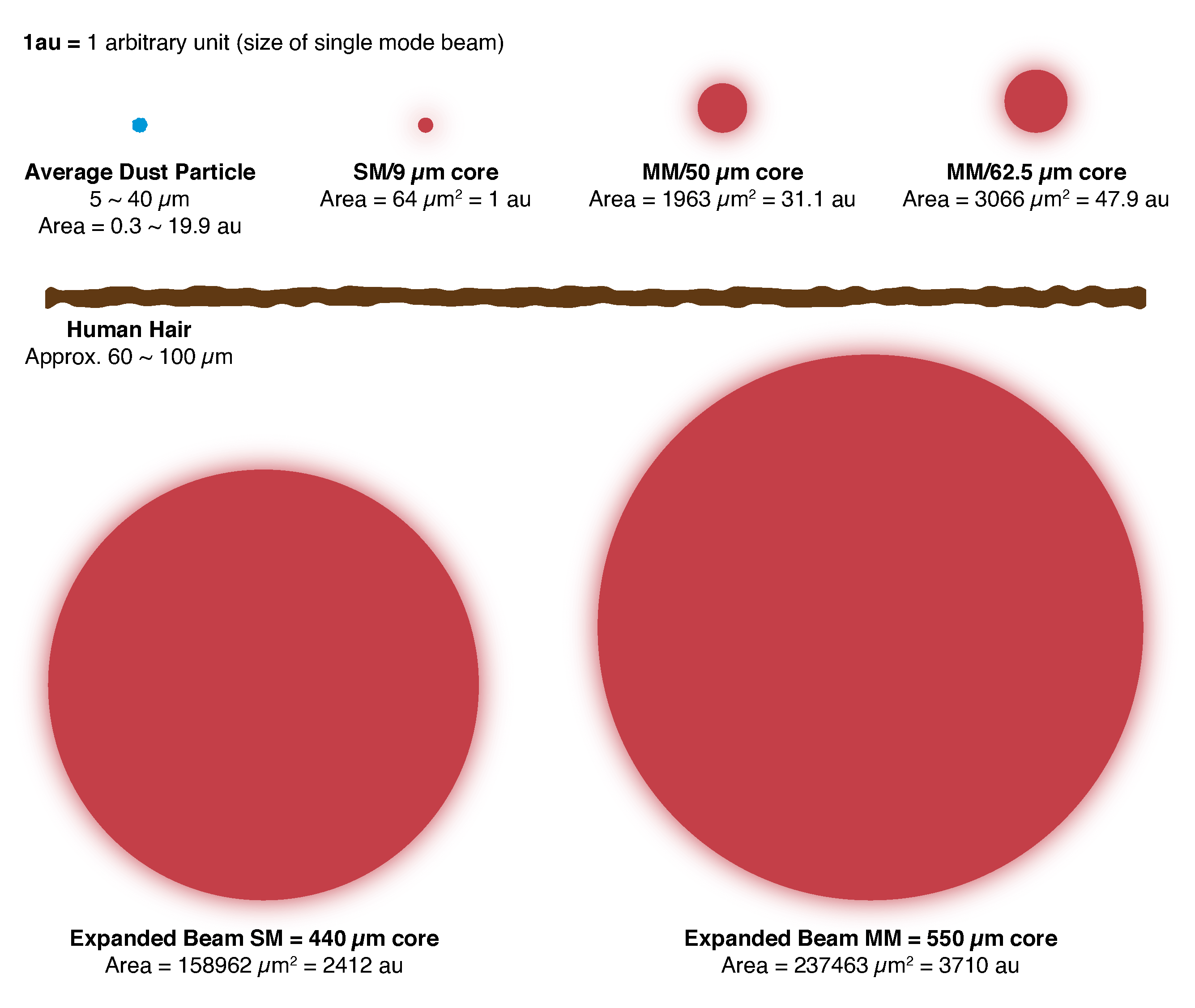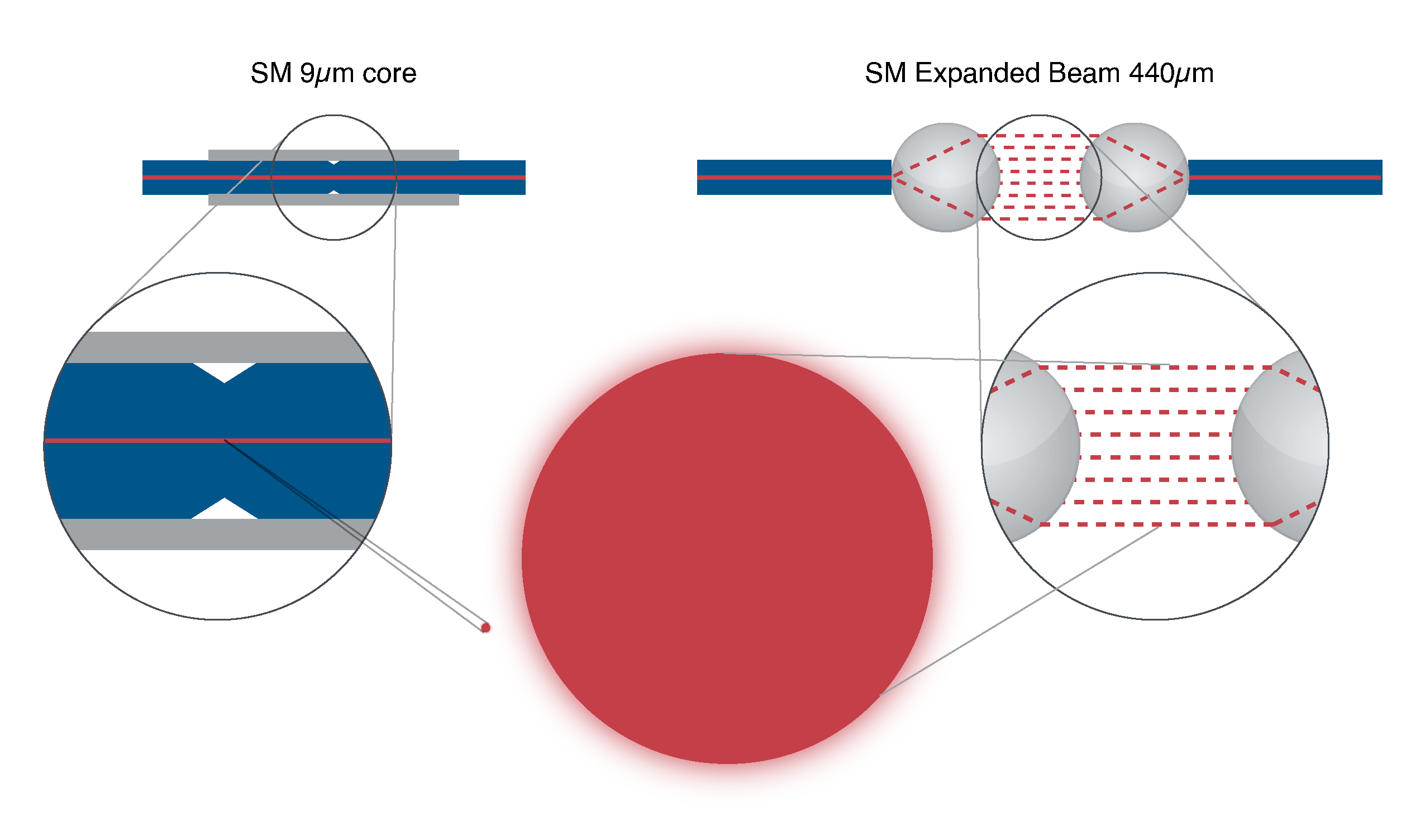 For instance, with physical connections, dirt particles between Ø5 μm and Ø40 μm can cause transmission issues. Indeed, a dust particle of just Ø9 μm on a singlemode fiber core could completely block the transmission of the signal. In harsh environmental conditions, deploying this type of connector may be cost effective, but their susceptibility to damage by small dust particles makes expanded beam connections a more reliable choice.