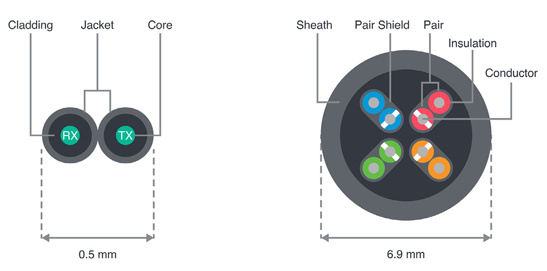 Figure 1: Comparison of a typical fiber cable (left) to Cat 5 copper cable (right). Not to scale.