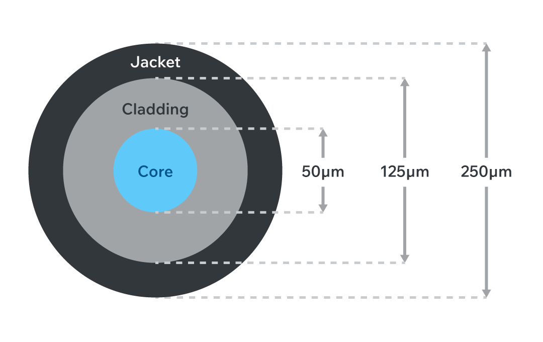 Cladding: Surrounding the core, the cladding is made from material with a lower refractive index. This index differential enables total internal reflection, allowing light to remain confined within the core. The cladding typically has a standardized outer diameter of 125 µm, regardless of fiber type.