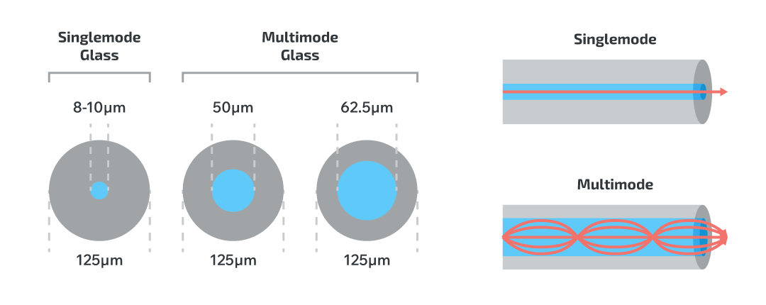 Fiber optic cables are categorized as either singlemode or multimode, depending on the diameter of the core and the number of light propagation paths, or modes they support. Selecting the appropriate type is critical for optimizing system cost, performance, and scalability.