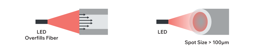 Figure 8. Diagram showing how a wide light beam from an LED overfills a multimode fiber, increasing modal dispersion