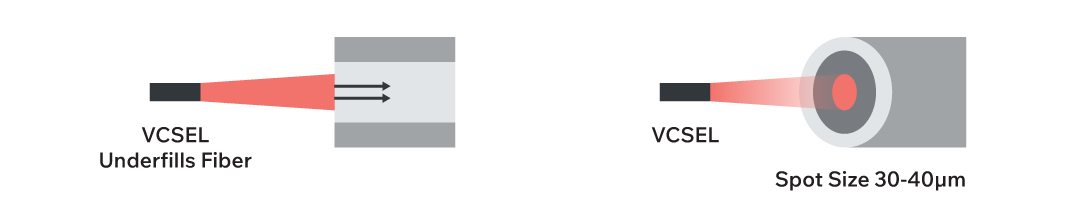 Figure 9. Visualization of a VCSEL’s focused beam entering a multimode fiber with better mode control than an LED.