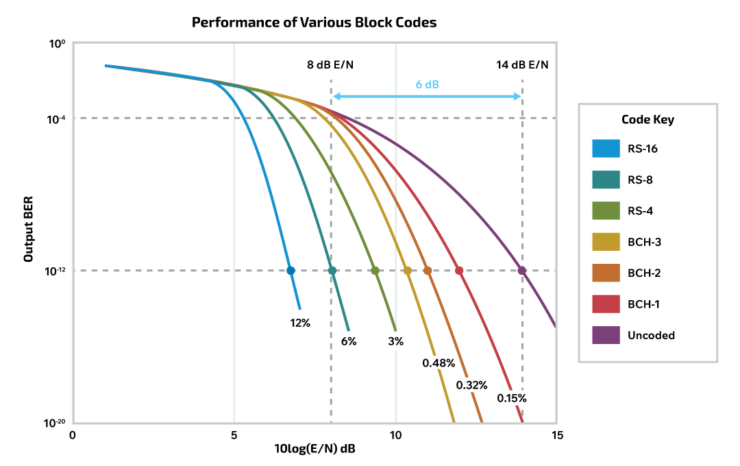 The Reed Solomon coding is a standard FEC method used in high-speed optical networks, specifically RS (255, 239) which indicates there are 255 symbols per data block: 239 information symbols and 16 parity symbols. This coding scheme can correct 8 random errors per data block. The RS (255, 239) encoding adds 6.3% symbol overhead to the data stream (239/255 = 93.7% data, 6.3% overhead) which means that the codeword transfer rate must increase by 6.3% to maintain the original information symbol transfer rate.