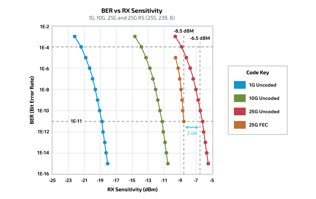 The graphs in Figure 5 plot BER values versus RX sensitivity for 1, 10, and 25 Gbps systems. The graph also shows how the addition of FEC improves the 25 Gbps system performance. In the 25 G uncoded case, the system needs an RX sensitivity of at about -6.5 dBm to achieve 10-11 BER performance. When FEC is employed, the RX sensitivity is improved by about 2 dB to a value of about -8.5 dBm to achieve the same 10-11 BER performance.