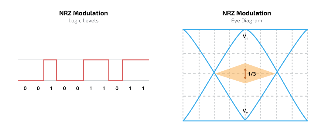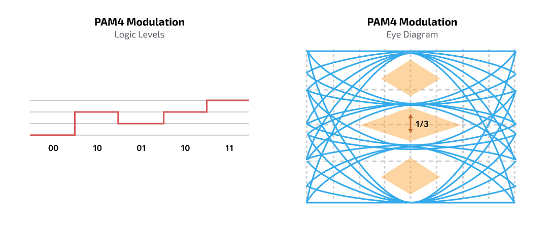 One of the simplest improvements to NRZ modulation is pulse amplitude modulation 4 (PAM4). In PAM4, there are four levels per symbol and thus two bits of data are transferred in each symbol. More advanced modulation techniques employ greater numbers of amplitude and phase levels, but for this discussion, PAM4 is easy to understand and effectively demonstrates the main concepts.