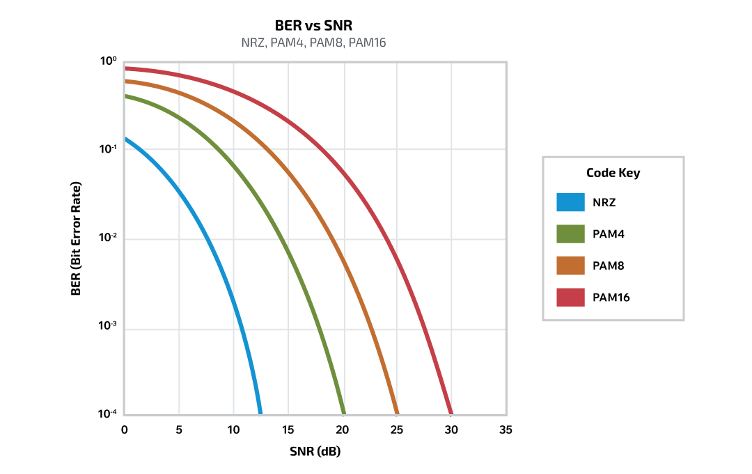 One key challenge in PAM4 implementation is that the amplitude of its logic levels are only one-third of those in NRZ modulation when maintaining the same symbol amplitude. The reduced logic level amplitude lowers the SNR of the system by 9.5 dB at 10-4 BER. If the noise levels of the receiving decoder circuits are not reduced, the BER of PAM4 will be significantly decreased relative to NRZ modulation. A 9.5 dB hit in PAM4 performance compared to NRZ often means that there are normally bit errors always present even without being anywhere near the RX sensitivity limits.